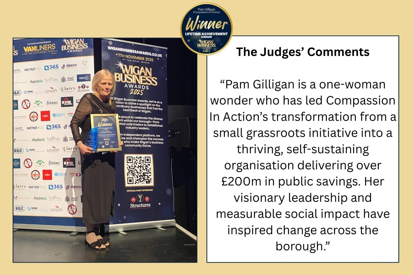 CEO of Compassion In Action, Pam Gilligan, has been presented with the ‘Lifetime Achievement Award’ at the 2025 Wigan Borough Business Awards.